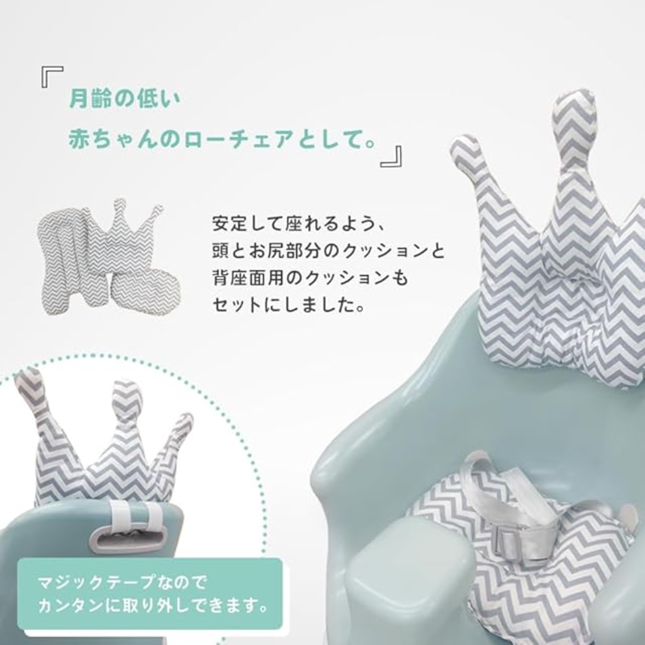 【ご購入前の注意】※商品仕様変更に伴い、頭用クッションにHugmuuのロゴ入りタグが縫い付けられています。(タグサイズ:約2cm)順次切り替えとなるため、生産時期やご購入時期により、タグのあり/なしにばらつきが生じる可能性がございます。予めご了承ください。 【これ1つで長く使える多機能ベビーチェア】ベビーチェアとしてはもちろん、付属品を使用することで赤ちゃんの月齢や使用シーンに合わせて様々な使い方が可能です。・ソファーチェアやローチェアとして。・プレートをつけて離乳食やごはんのときのダイニングチェアとして。・高位置固定バンドで大人用のイスに取り付ければハイチェアに。・チェア単体でバスチェアとして。水が溜まりにくい設計なので、お風呂でも使用が可能です。※シートベルトは防水ではありません。※使用後は必ずしっかりと水を切り、乾かしてください。