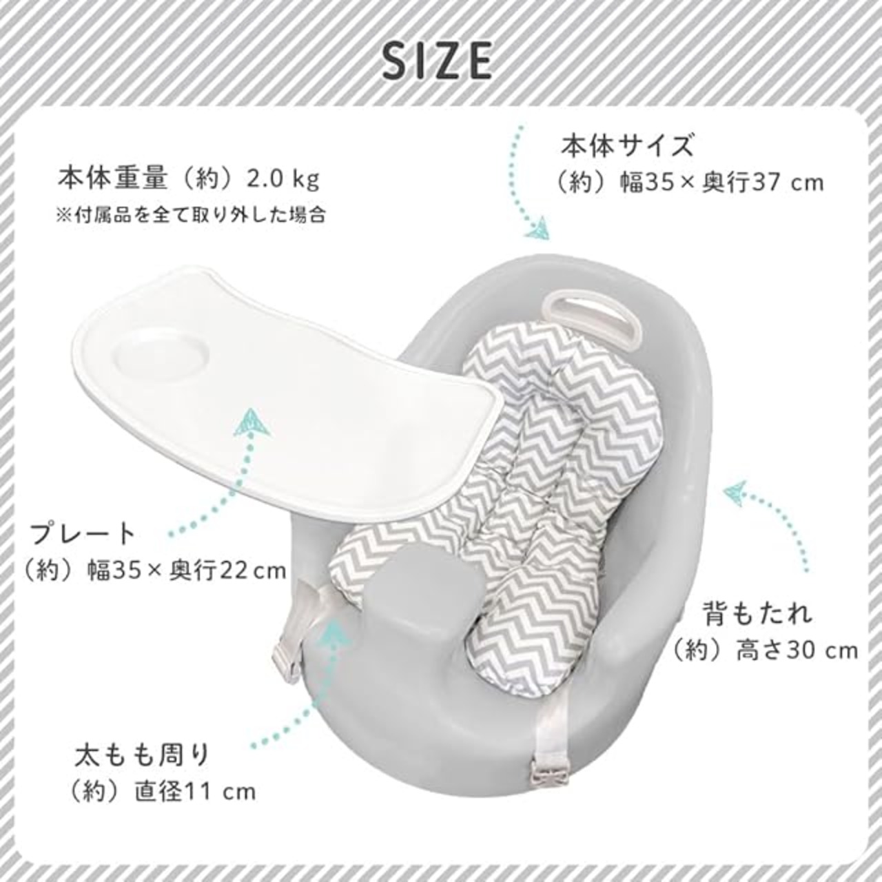 【製品仕様】本体サイズ:(約)幅35×奥行37×高さ30cm、プレート:(約)幅35×奥行22cm、太もも回り:(約)直径11cm、本体重量:(約)2.0kg、対象年齢:<10点セット>生後3ヶ月~5歳頃まで、素材:熱可塑性ポリウレタン、ポリプロピレン