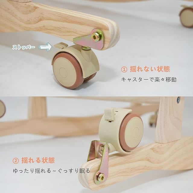 やさしく押すとゆったり揺れる~赤ちゃんは母体を思わせる安心感。キャスター付きの2wayスタンド設計、移動、固定を切り替えてお使いいただけます。