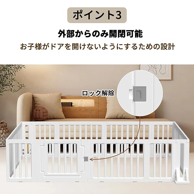 【外部からのみ開閉可能】ベビーサークルを開けたいときは外側からしか開けられない、ベビーサークルの外側のみにロックが付いている設計なので、大人はベビーサークルの外側から簡単にベビーサークルを開けることができます。赤ちゃんはベビーサークルから脱出を効果的に防ぎます。