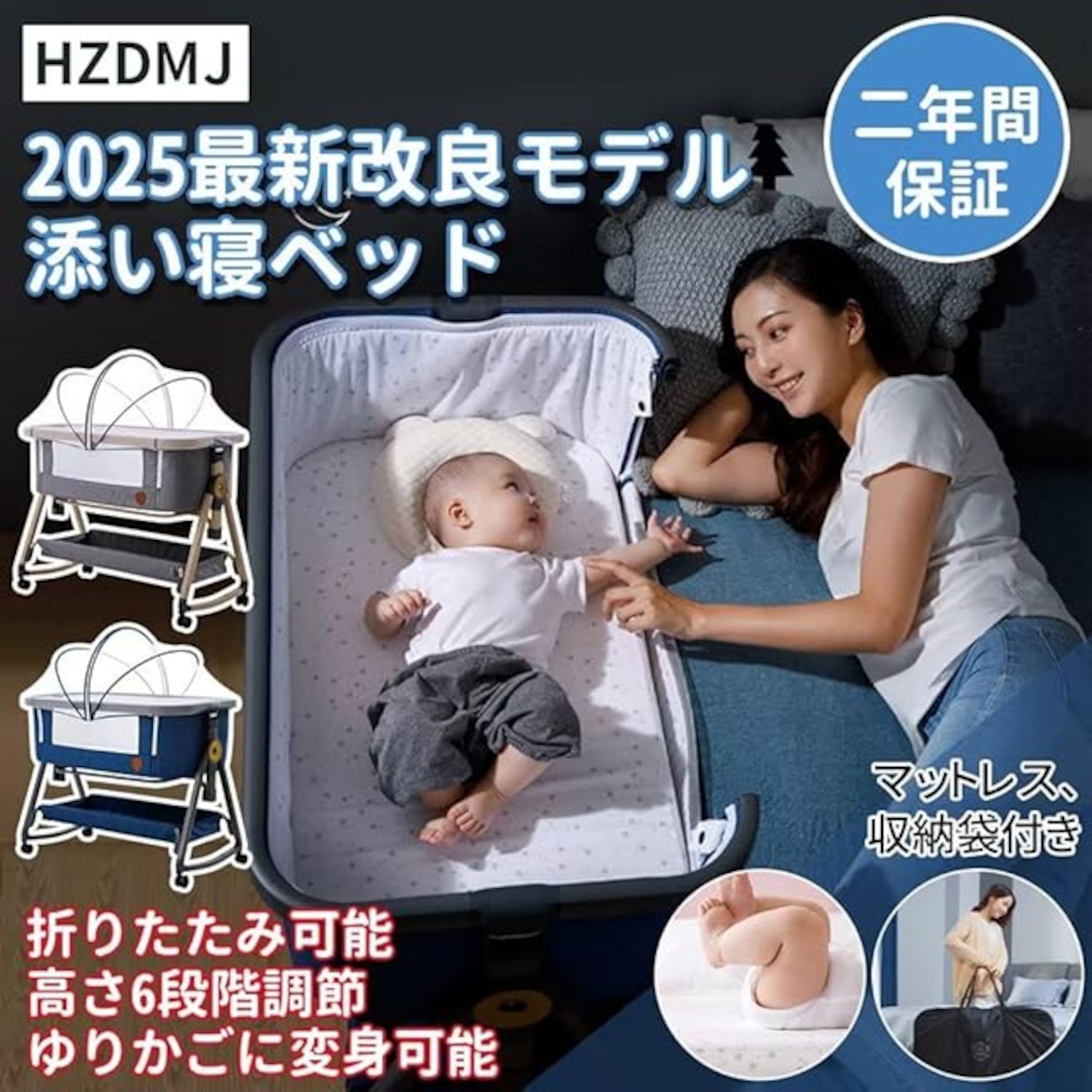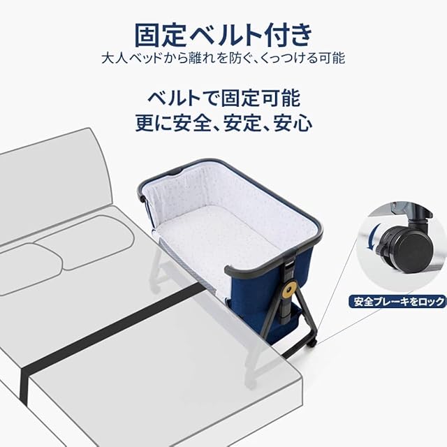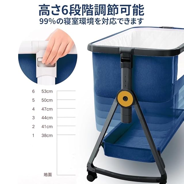 【高さ多段調節】高さ6段階調節可能で、各高度の大人ベッドにくっつけてご利用可能です。静音式のボタン設計で、自由に高さ調節し、お子様は振動を感じしなく、驚かないです。ベッドは少し傾き、新生児に対してミルクの吐くことを防ぐことができます。