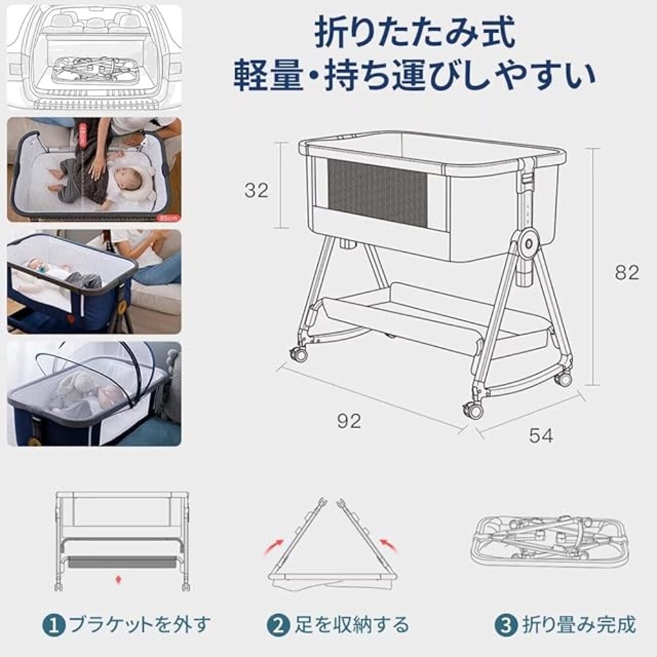 【商品詳細】 対象:0ヶ月 ~ 素材:高炭素鋼+綿 展開サイズ:92×54×82cm 収納:92×54×15cm 重さ:8kg ベビーベッド/添い寝、大人ベッドの高さ同じに調節できるし、固定ベルトつき、各高度の大人ベッドにくっつけてご利用可能です。下に収納かごつき、布団とおもちゃなどを入れて簡単に収納できます。