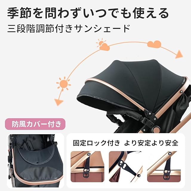 【大きいタイヤと衝撃吸収性に優れた構造】ベビーカーのタイヤは大径なうえ、衝撃を吸収するサスペンション・回転を滑らかにするベアリングが搭載されています。赤ちゃんに振動が伝わりづらく、段差の乗り越えがスムーズ。後輪にブレーキ付き、ワンプッシュで、ベビーカーはすぐに後輪をブレーキ可能な状態で駐車します。