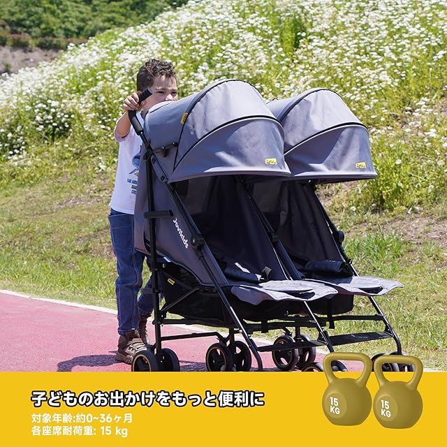高品質な2人乗りベビーカー:300Dオックスフォード生地と鉄管フレームで作られ、各シートは15kgまで対応。高品質な素材が、赤ちゃんの冒険を安全かつ快適にサポートします。
