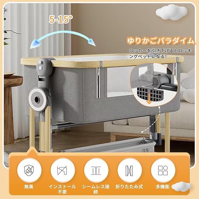 【おむつ替えテーブル付き】 取り外し可能なおむつ台は、おむつ替えテーブル付きで便利です。ママに優しいデザイン。おむつ替えや着替えが簡単です。ママは腰をかがめなくてもいいです おむつ替えテーブルが付きます。ママへの腰の負担が少なく、赤ちゃんにとっても衛生的!ベビーベッドの両側の通気メッシュが空気の流れをよくし、赤ちゃんに快適な睡眠環境を提供します。