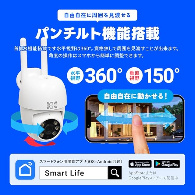 【パンチルト機能で角度変更】首振り機能を搭載!水平視野は360°で死角がありません。角度操作はスマホで簡単に調整することが出来ます。