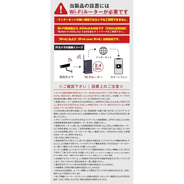 ※屋外で使用する際はカサを上にして使用して下さい。カサを下にすると雨がカメラ内部に入り、故障の原因になります。※一時間に4回以上動体検知の通知が来る場合は、電源コードを接続して使用して下さい。※リアルタイム監視の際、サーバーの混雑を防ぐため約10分で接続が自動的に切断する仕様となります。またサーバーが混雑すると10分より短くなる場合がございます。お客様の方で再度、接続をお願い致します。※かんたんスマホ等のAndroid端末の一部は使用できない場合があります。※Softbank光回線は、ルーター装置により通信がブロックされる場合があるため、正常に動作しない可能性がございます。※カメラのデザイン・スペック・仕様・機能などは予告なく変更となる場合がございます。