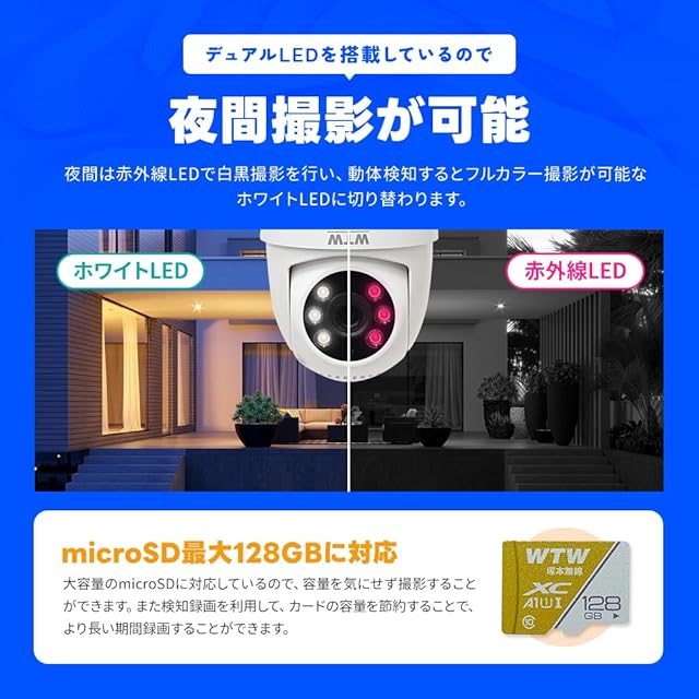 【防犯灯機能で夜間撮影】ホワイトLEDを搭載しているので夜間でも明るく照らし出し、防犯効果を高めます。また24時間フルカラーで撮影することが出来ます。