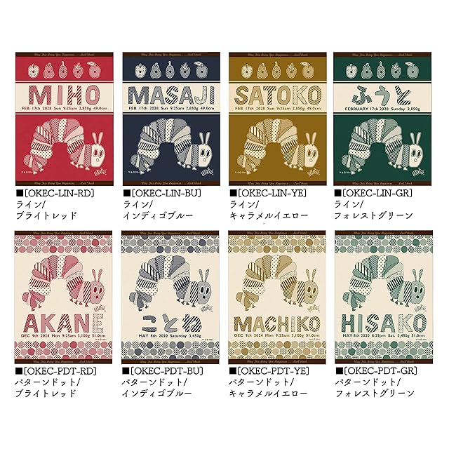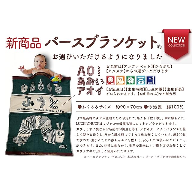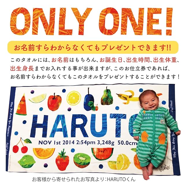※大人気絵本“はらぺこあおむし”の作者エリック・カールとLUCK*CHUCKのコラボレーションデザイン33デザインが掲載された『カタログ』と、『オーダー用紙』、お仕立券No,が記載された『お仕立券』の3部を専用のラッピング封筒にお入れしてお届け致します。 ※今治製のタオルに「お名前」「お誕生日」「出生時間」「出生身長」「出生体重」が入った世界で1枚のタオルがお作りいただけます。