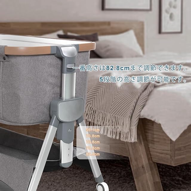 【高さ5段調節】5つのギアの高さは好きなように変更でき、固定ベルト付き、各高度の大人ベッドにくっつけてご利用可能です。サイドの囲いを取り外して、大人のベッドにくっつけて添い寝モードに切り替えでき、市場に出回っているベッドタイプの99%と互換性があります。