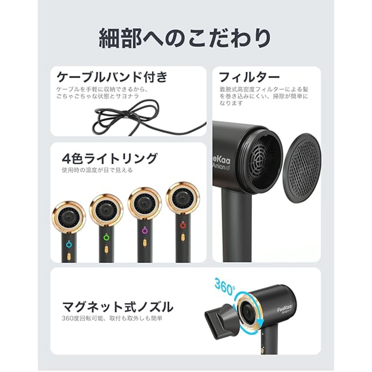 Feekaa ドライヤー 大風量 速乾 軽量 低騒音 低温 ヘアケア 2億高濃度マイナスイオン スピーディー ヘアドライヤー 【4段階温度調節 2段階風速調節】ノズル付き 過熱防止機能 コンパクト 持ち運び便利 家庭用/ヘアサロン/出張用/旅行用/祝日のプレゼント PSE認証済み 黒 | ascend