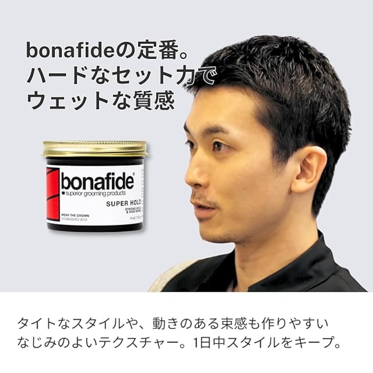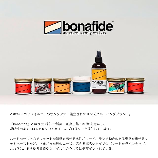 【BONA FIDE POMADE/ボナファイドポマード】2012年にカリフォルニア サンタ・アナで生まれたメンズグルーミングブランド。 “Bona Fide”とはラテン語で“誠実・正真正銘・本物“を意味し、100%アメリカンメイドに拘った愚直なプロダクトを展開。ツヤ感の違いや、セット力の違いによって幅広くヘアスタイリング剤を取り揃えている。高いセット力、髪への付けやすいテクスチャーに加え、簡単に洗い流せる高い機能性とデザイン性を兼ね備え、使い勝手の良い商品はアメリカを中心としてヨーロッパやアジア、南米と世界各国で取り扱わている。