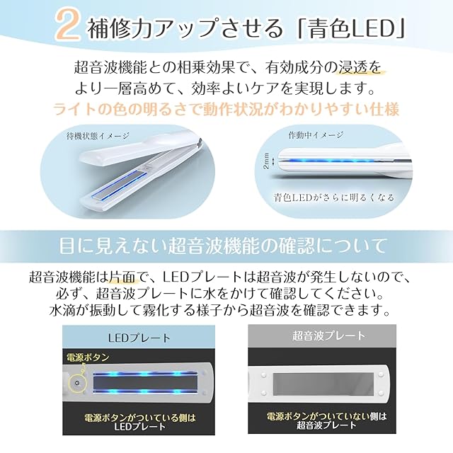 【超音波×青色LED】波長470nm青色LEDエステサロンでも注目の高い技術の一つです。超音波機能が作動する同時に青色LED照射も同時に行うことで髪の表面からだけでなく、髪の内部と外部からダブル補修します。傷んだ髪を髪質改善し傷みにくい髪質へ!10分だけのセルフケアでがサロンクオリティに。※本製品はストレートアイロンではございません。