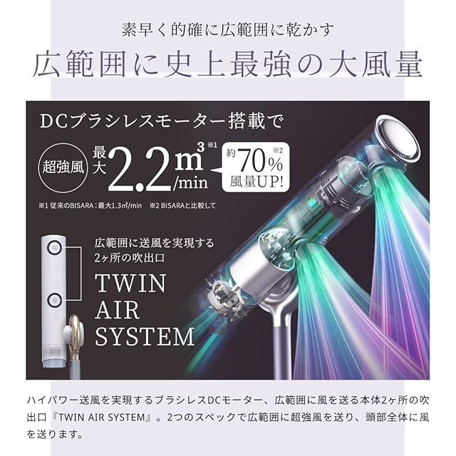 <b>シリーズ史上最強風のハンズフリースタンドヘアドライヤー「BISARA PRO」</b><br> <br> <b>★特徴</b><br> ①髪を乾かしてもらっているような贅沢な時間を提供する、スタンドタイプのハンズフリーヘアドライヤー<br> ②DCブラシレスモーターを搭載し、シリーズ史上最強の風量と静音設計を実現<br> ③やわらかな光を放つLEDライトで、心地よい癒しの空間を演出<br> <br> <b>■理想のブローは15~20cm&角度45度</b><br> 高い位置から髪の流れに沿って乾かすことができるので、まるで美容室でブローしてもらったようなしなやかでさらさらに。<br> また温風・冷風を交互に送風する「美髪モード」で、熱による髪へのダメージを抑えることができ、艶やかでまとまりのある美髪に仕上げます。<br> 温風と冷風を交互に繰り返す効果とは 髪が濡れている時はキューテクルが開いているので、ダメージを受けやすい状態です。 その為、温風で手早く乾かすことが必要です。<br> ただし、髪が濡れている時は、外部からの刺激を受けやすい状態になっています。 温風を当てすぎると、髪はダメージを受けてしまうのです。<br> 髪の表面の温度が100度以上になると、髪を構成しているタンパク質が熱変性を起こします。 それによって、切れ毛や枝毛の原因になってしまいます。<br> 髪の表面が熱くなり過ぎないように、温風と冷風を交互に繰り返すことによって、ダメージを受けないようにすることができます。<br> ※全ての送風にマイナスイオンが含まれています。<br> <br> <b>■BISARA史上最強風</b><br> 「BISARA PRO」は高性能DCブラシレスモーター搭載することで、BISARA史上最強風を実現しました。<br> 両手をふさがれることなく、髪を乾かしながらスマホ操作やスキンケアなど自由な時間を過ごしていただけます。<br> またLEDライトがやわらかな光で癒しの空間を演出。プロのスタイリストにブローしてもらっているような特別なひとときを体感していただけます。<br> <br> <b>■DCブラシレスモーター搭載</b><br> DCブラシレスモーターを搭載することで、2.2㎥/minの大風量を実現!<br> 従来品に比べ70%風量がアップ。広範囲+大風量の送風を実現し、速乾性も向上しました。<br> ドライヤー本体に設置されているスイッチで、風量は3段階、温度は5段階の調節が可能です。<br> 「髪が長く乾きにくいので風量を強めに」「髪へのダメージを抑えたいので温度を低めに」など、ヘアスタイルや乾燥時間に合わせてお使いいただけます。<br> <br> <b>■TWIN AIR SYSTEM</b><br> ムラなく広範囲に髪を乾かせる「TWIN AIR SYSTEM」を搭載<br> ドライヤー本体上部と下部、2ヵ所に吹き出し口があるので、広範囲に2億個のマイナスイオンを含んだ風を送ることができます。<br> 頭頂部から髪先まで全体に風をあてるので、ムラなく髪を乾かすことができます。<br> <br> <b>■【NEW!】髪全体に風を送る自動首振り機能</b><br> 左右約20°の首振り機能を搭載。頭部全体に風が行き届くので、より均一にムラなく髪を乾かします。<br> <br> <b>■美髪モード</b><br> 高い位置から髪の流れに沿って乾かすことができるので、まるで美容室でブローしてもらったようなしなやかでさらさらに。<br> また温風・冷風を交互に送風する「美髪モード」で、熱による髪へのダメージを抑えることができ、艶やかでまとまりのある美髪に仕上げます。<br> <br> <b>■マイナスイオン2億個</b><br> マイナスに帯電した酸素と空気中の微細な水分が結合した「マイナスイオン」によって、髪表面に帯電したプラスの静電気などを中和します。<br> マイナスイオンドライヤーを使うことで髪にツヤ感やうるおった印象を与えられるので、つややかな髪を目指したい方におすすめです。<br> <br> <b>■細かな温度、風量設定</b><br> 風量は3段階、温度は5段階の調節が可能です。「髪が長く乾きにくいので風量を強めに」<br> 「髪へのダメージを抑えたいので温度を低めに」など、ヘアスタイルや乾燥時間に合わせてお使いいただけます。<br> <br> <b>■静音設計</b><br> BISARA史上最大の風量でありながら、作動音は最大62dBと静音設計。<br> 従来品(最大78dB)に比べ約20%駆動音を軽減し、これまでより静かに髪を乾かすことができます。<br> <br> <b>■デジタルディスプレイリモコン</b><br> 手にフィットするように設計された丸形リモコンは、マグネット式で本体にピタッと脱着ができ、デジタルディスプレイ搭載で一目で現在のモードがわかります。<br> 新たに搭載された『チャイルドモード』は風量「中」、温度レベル「60」の熱すぎない温風で、お子様にも安心してお使いいただけます。<br> <br> <b>■お好みの高さと角度を調整可能</b><br> 吹き出し口(ドライヤー本体)は高さを96~137cmの間で、角度を上下180°の範囲で調節することができます。<br> 使用するシーンに合わせ、使いやすい高さ・角度を調節してお使いください。<br> <br> <b>■ハンズフリーだから幅広いシーンで活躍</b><br> 手をふさがれずにドライヤーが使えるメリットは、髪を乾かす時間を自由に使えることだ
