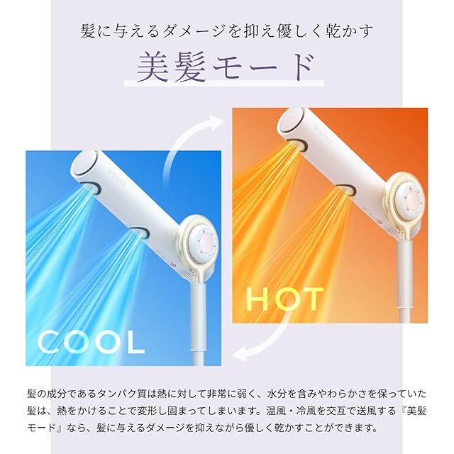 【美髪モード】温風・冷風を交互に送風する事で髪へのダメージを抑えて優しく乾かし、艷やかでまとまりのある髪に仕上げます。