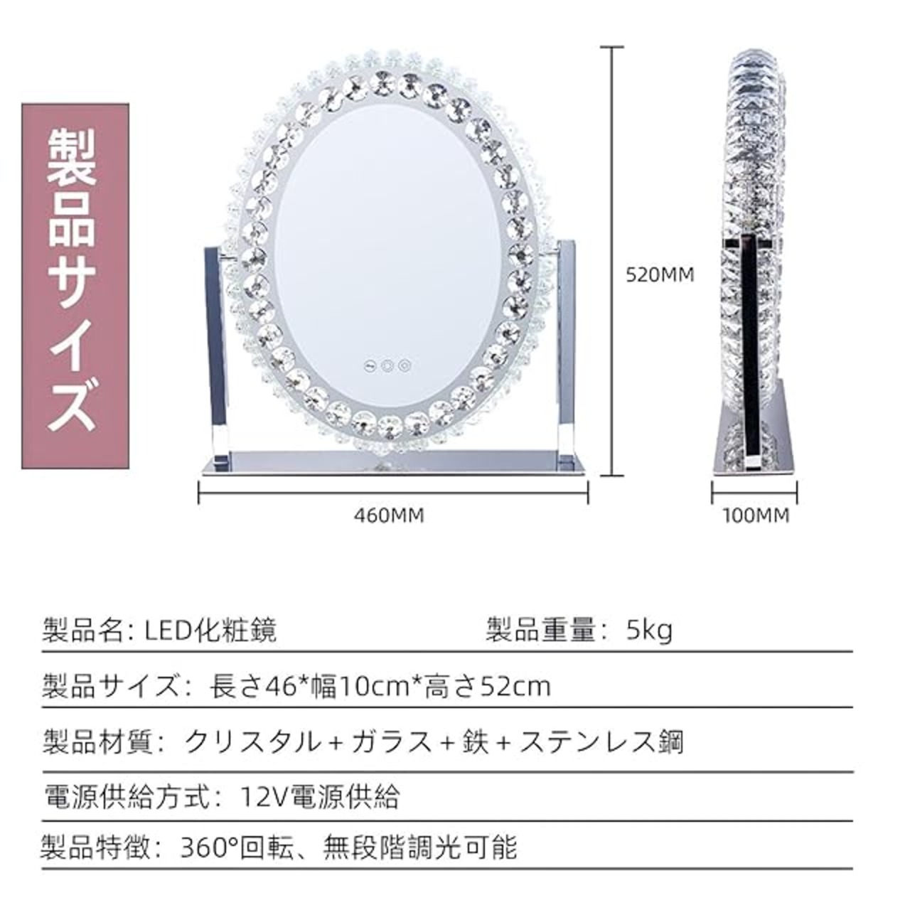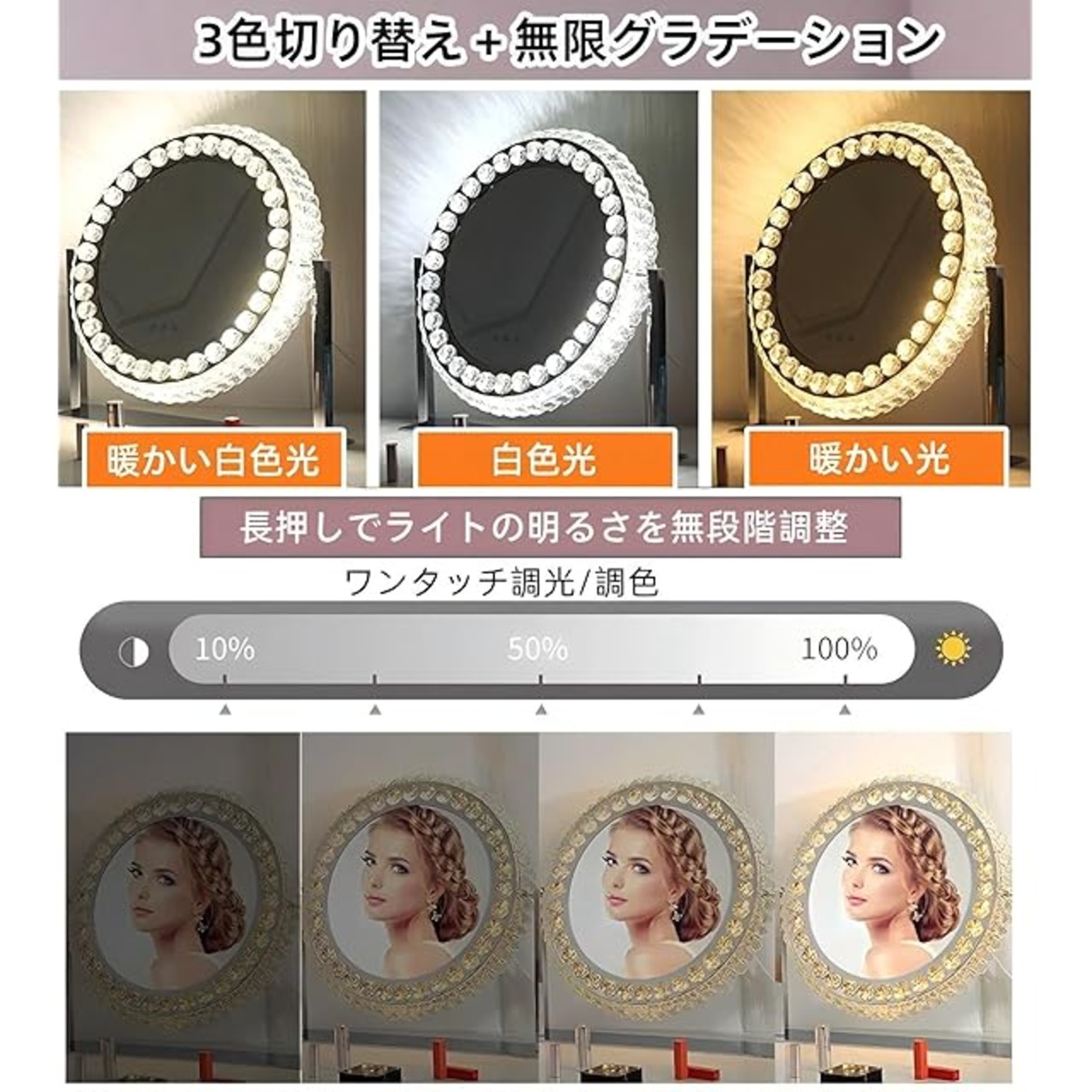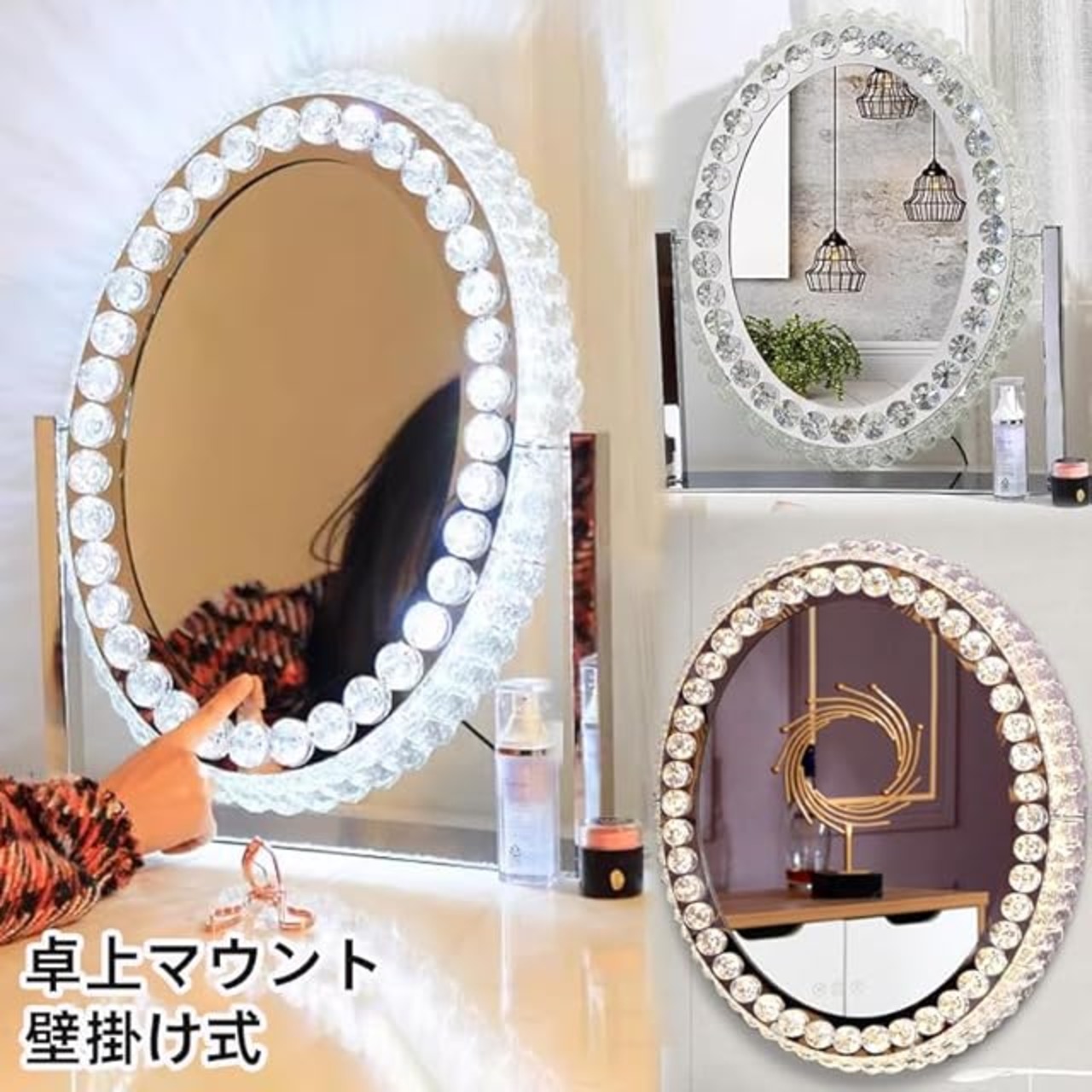 LOOPFKL 女優ミラー 卓上/壁掛け 大きい ハリウッド 女優 LEDライト付き おしゃれ クリスタル 化粧鏡 明るさ調節可能 三色 無段階調光 女優鏡 ライト付きミラー スタンド 卓上 360度回転