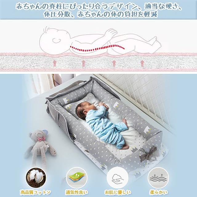 【赤ちゃんにより良い睡眠を与える】ベビーベッドは、肌に優しく通気性があり、無害である優れた綿で作られています。活性染色技術を採用されていることで、とても安全で色も褪せず、赤ちゃんに安らかに眠れるようにしています。ベビーベッドは赤ちゃんの背骨にフィットするように設計されており、背骨がバランスの取れた力を受け、赤ちゃんにストレスなしで良い睡眠を与えます。