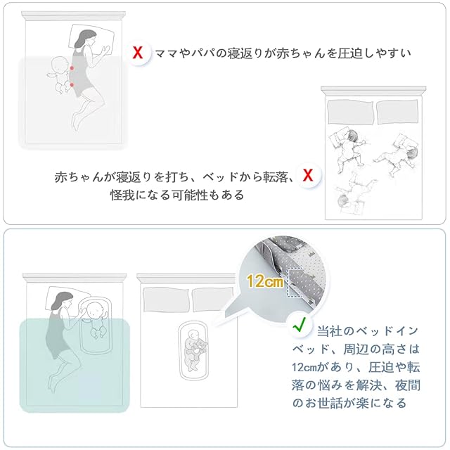 【安全性を備えるベッドインベッド】ベビーベッドのガードレールは12cmの高さで、赤ちゃんが乗り越えたり、床に転んだりするのを防ぐことができます。赤ちゃんが親と同じベッドにいても、防圧隔離効用があるので、熟睡中の親が赤ちゃんを圧迫するのも防げ、赤ちゃんと親を安心に寝付きくれます。