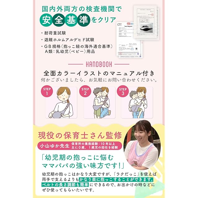 【 素材 】コットン100%、ベルト部分:ポリプロピレン、(原産国) 中国、【 商品内容 】ラクだっこ本体、取扱説明書、収納袋