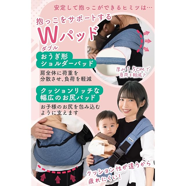 【 ママパパの負担を軽減/お子様への安心を考えた構造 】荷重がかかる親御さんの肩部分は、肩全体に負荷が分散する" おうぎ形ショルダーパッド "を採用。お子様のお尻部分には、しっかりとお尻を支える" 幅広ヒップシート "を採用。また、ヒップシートの反対面は、お子様がズレるのを防ぐ" 滑り止め加工 "を施しております。