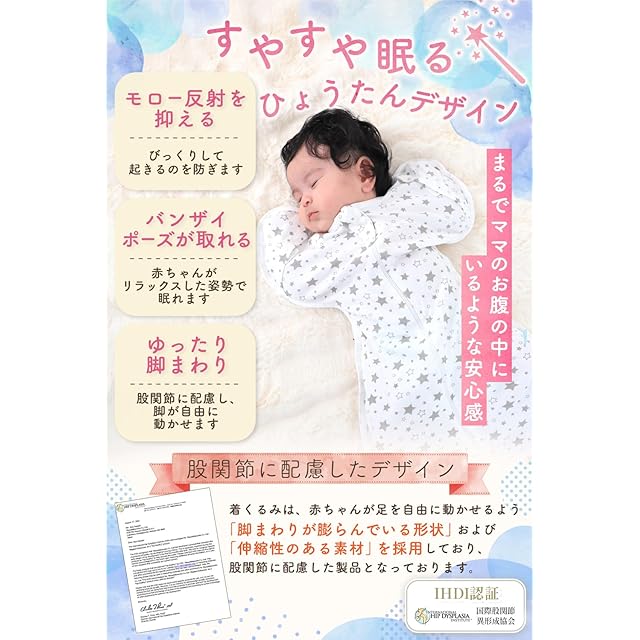 【 赤ちゃんの股関節に配慮 】本製品は赤ちゃんが脚を自由に動かせるように” 脚まわりが膨らんでいる形状 ”および” 伸縮性のある素材 ”を採用しており、股関節 に配慮した製品となっております。脚まわりが 直線的なスワドル を使用した場合、 赤ちゃんの脚が十分にM字の状態に保つことが出来ず、脱臼のリスクが高まるリスク がございますので十分ご注意ください。