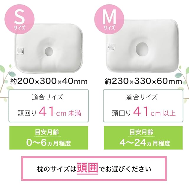 ジオピローサイズ/適合年齢:【Sサイズ】200×300×40mm 頭囲40cm以下推奨、目安月齢0ヵ月~6ヵ月程度 【Mサイズ】230×330×60mm 頭囲41cn以上推奨、目安月齢6ヵ月~2歳 程度 ※6ヵ月未満で頭囲41cm以上の場合、Mサイズをお選びください。体格により枕の高さが高い場合は赤ちゃんの下にシーツやタオルを敷き高さ調整をしてお使いください。 絶壁予防 絶壁対策 向き癖対策 におすすめです。