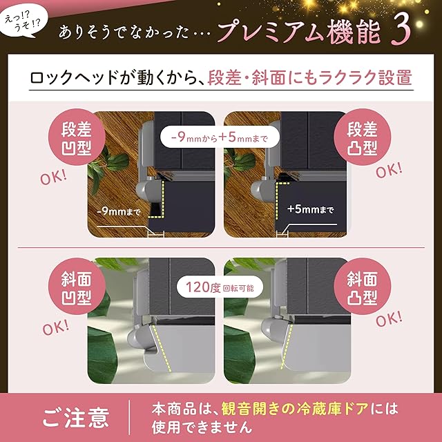 ✅【段差にも設置可能】凹型ドアフレームの場合、-9㎜。凸型ドアフレームの場合、+5㎜まで設置可能。【斜面にも設置可能】冷蔵庫のドア側に設置するロックヘッドは、120度回転でき、斜面にも設置可能です。子供安全ロック、ベビーガード、引き出しロックとして、また、赤ちゃんやペットのいたずら防止、地震対策にも有効です。