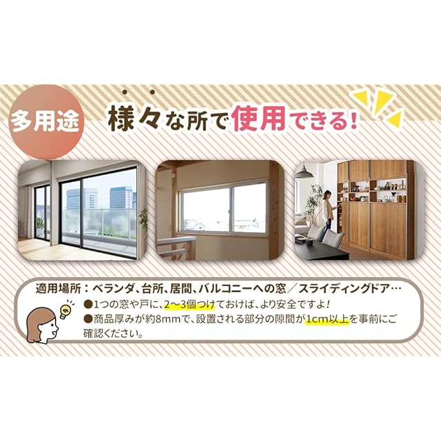 『防犯対策・いたずら防止』ガラス窓やアルミサッシなどの引き戸を、勝手に開けないようにするための窓用の補助錠です。子供やペットのいたずら防止にもなり、フィルムと併用することで泥棒防犯対策にもなります。『窓ストッパーの適用範囲』スライド式の窓、引き戸、ドア、戸棚、ワードローブなどに適用できます。より安心で安全な環境を作りましょう!