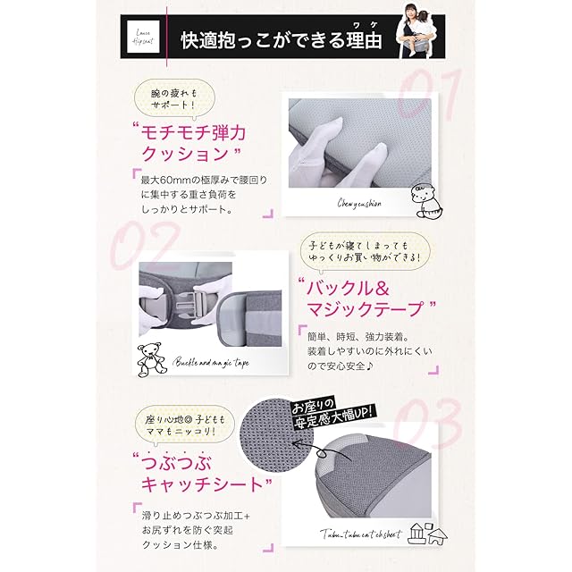 【お座り快適設計】①優しさパッド付き補助ベルト ②U字型滑り止め付きシート ③お子様の擦れ防止(保護布を追加したことにより大切なお子様の体が擦れるのを防止します。) 《メッシュ蒸れ対策》通気性に優れご使用者様、お子様ともに快適にご使用いただけます。 ウェスト部分には「60mmの極厚クッション」仕様で優しくフィットし季節を問わずご使用いただけます。シート座面(内部)は、赤ちゃんの足の開きに合わせた丸みU字構造により、股下を中心に自然なM字体勢でお座りいただけます。パパ・ママ・赤ちゃん皆が快適に使用出来るよう設計いたしました。
