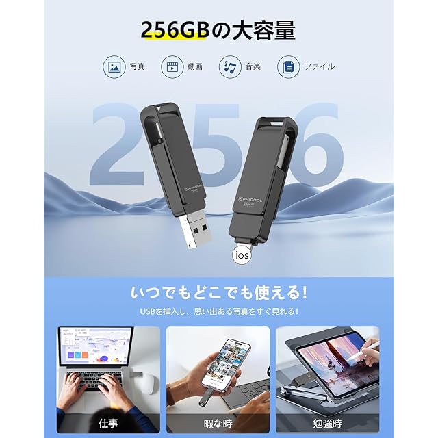 【スマホ容量不足解消・iCloud課金対策】スマホに保存されている動画や写真、ダウンロードされるアプリが多ければ多いほど、スマホの容量がいっぱいになり、それ以上データ保存はできなくなります。今は、スマホのデータをクリーンアップする必要はなくて、USBメモリをそっと挿入するだけで、スマホの写真データなどをUSBメモリに移行し保存できます。これにより、スマホの空き容量を増やすことができて、大容量の携帯を高価で買う必要もなく、iCloudに課金する必要もなくなります。