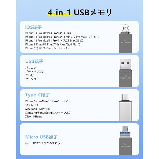【4in1・多機能usbメモリー】USBメモリはiOS、Type-C、USB、Micro USBの四つのコネクタを搭載し、Phone、iPad、パソコンからテレビやプリンターまで、ほとんどの機種と互換性があります。アプリ不要のUSBメモリをご利用いただき、スマホの容量不足を解消できて、写真保存・データ保存の機能も果たすことができて、データ移行、データ管理、ファイル移動、データ共有やファイル圧縮などの機能も搭載されます。