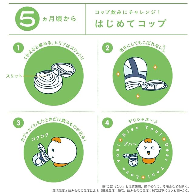【商品概要】 size:5ヶ月頃から: くわえたときだけ、飲める魔法のコップ。 size:6ヶ月頃から: 漏れない構造でゴクゴク飲める。340ml