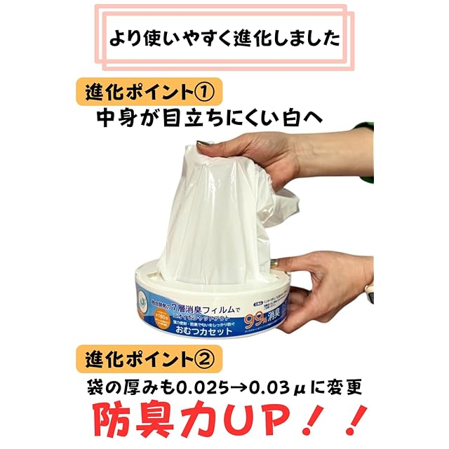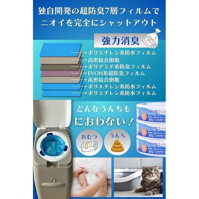 【 独自開発の7層フィルムで圧倒的な防臭力 】ベビーのべちゃべちゃなうんちがついたおむつやペットのうんちを入れても匂わない。材質テストを数十回試行して弊社独自の7層フィルムを開発。防臭能力の高いEVOH素材を他社比で1.5倍にして気になるニオイのシャットアウトに成功いたしました。モニターのママたちからも絶賛いただいております。