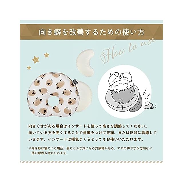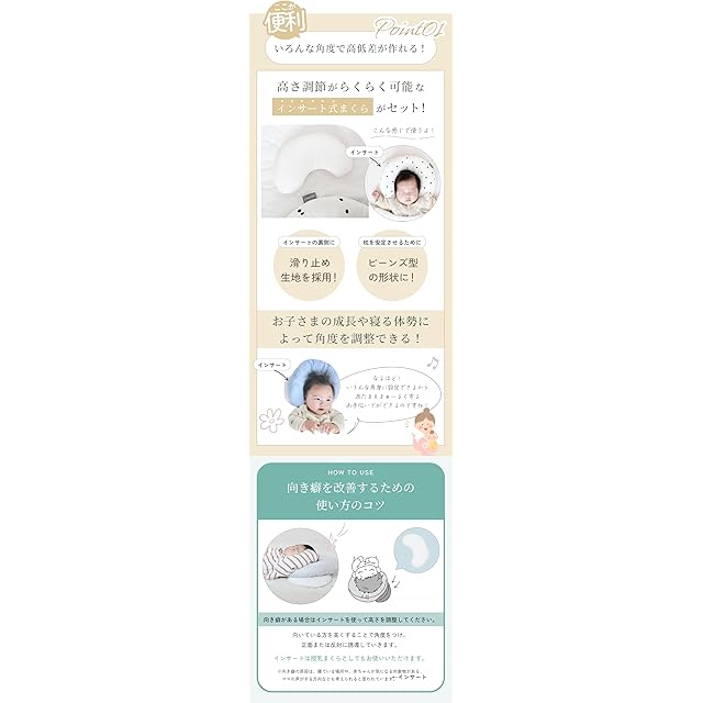 【高さ調整可能】取り外せるインサートパーツがついているから、赤ちゃんの成長に合わせ て枕の高さを調整できるので便利です。