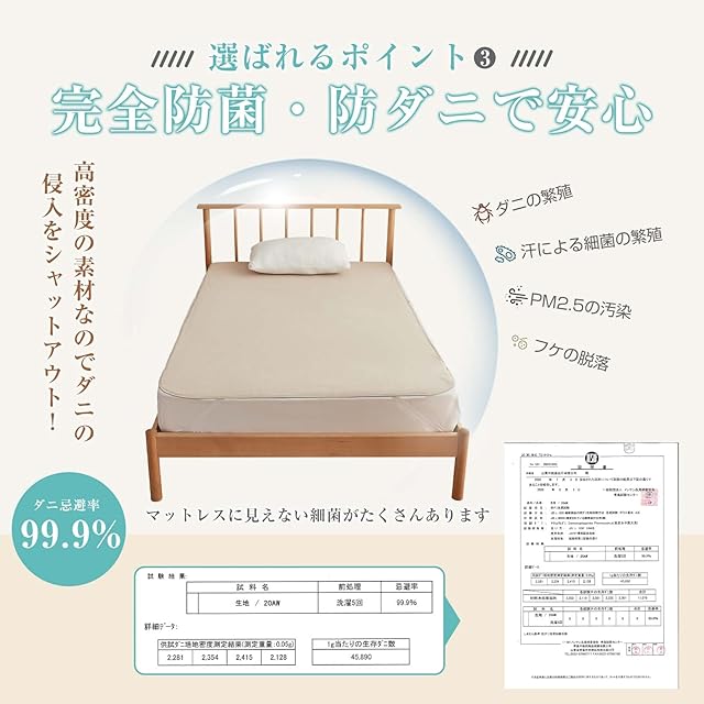 【お体に優しいダブル抗菌!】パイル地の基布と防水面は高密度素材を使用、細菌の繁殖を自然に抑えて、ダニの侵入もシャットアウトします。抗菌防臭効果には、SEKマークを取得し、清潔さにご安心できます。