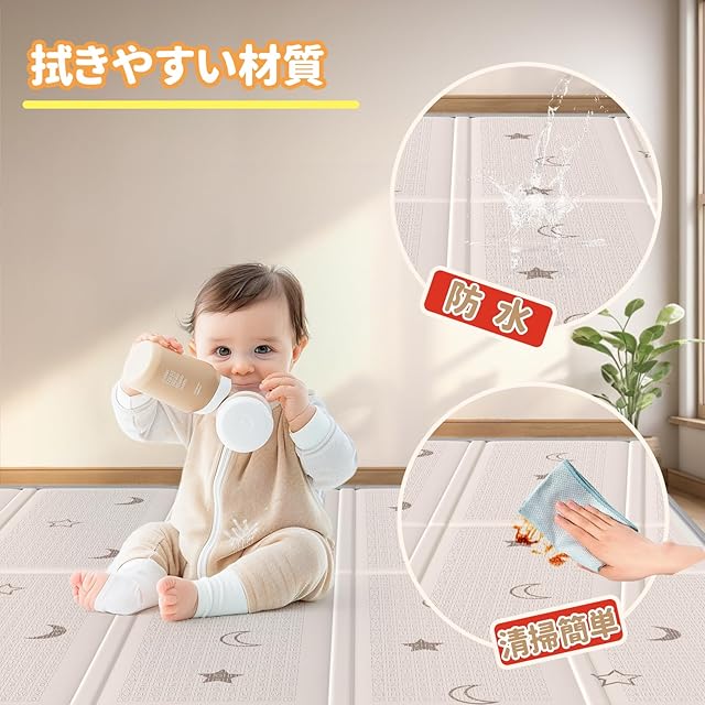 「滑り止め・防水・防汚効果」:マットの表面にこまやかなエンボス加工を施しています。子供が走っても滑りにくいので安心です。防水・防汚加工が施されており、汚れた場合は濡れた布でベビーマット表面の液体や汚れなどサッと拭き取れ、お手入れ簡単です!