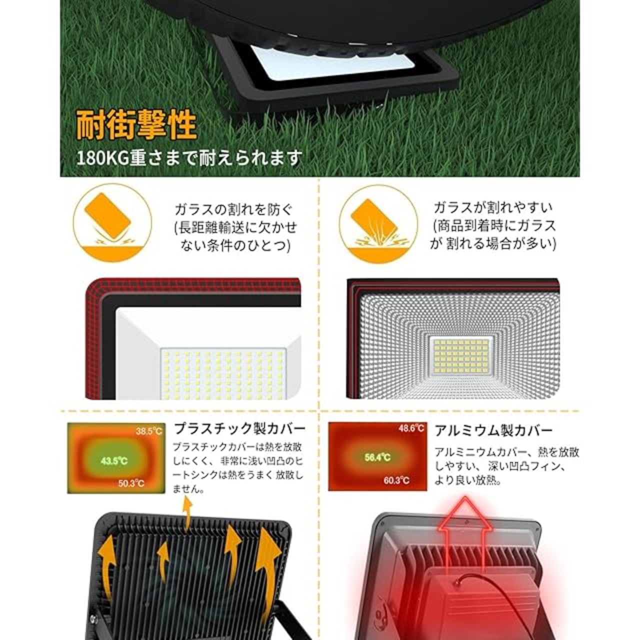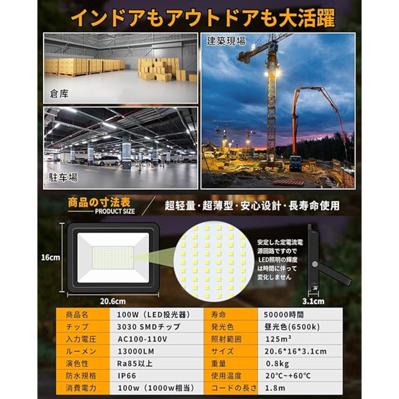 【2023超薄型・超高輝度な投光器】: チップ:SMD チップを採用、広角照射:120°、光束:13000ルーメン(1300w相当) 、色温度6500K(昼光色) 、接続線:1.8メートル°、電圧:100-110V 、重さ:0.8kg 、防塵防水:IP66、 放熱設計:6063型アルミ材質と櫛形ヒートシンク 、定格周波数:50/60Hz、寿命:約8万時間