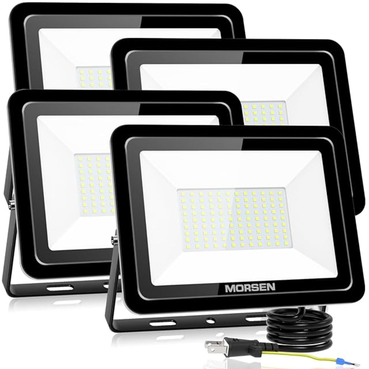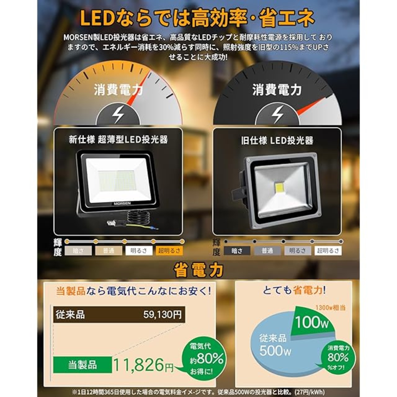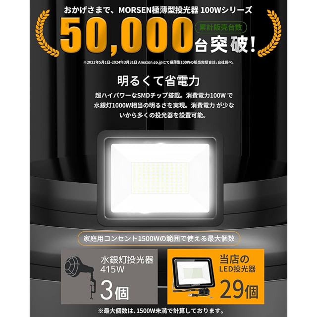 【スリム&タフ設計】MORSEN led投光器 100W 4セット投光器 13000LM 極薄型 投光器屋外 100v 灯光器 作業灯 外灯 工事用ライト ledライト 屋外用 野外 防水 看板灯 集魚灯 駐車場用(昼光色6500K, 100ワット)