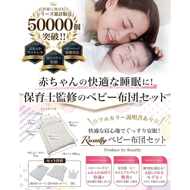 【保育士が監修】 Rozally ベビー布団セット がついに正式販売開始。 「ふかふかな寝心地のベビー布団が欲しい…」というお客様の声から生まれた 「枕」「掛け布団」「敷き布団」「マット」「シーツ」 が1つになったベビー用布団セットです。コンパクトに収納にして 持ち運び 可能な点も人気の1つです。 幼稚園や保育園のお昼寝で必要になる入園アイテムとしても購入頂いております。 企画&設計では 新生児 や 乳幼児 など 子供 の育児に詳しい【保育士】の先生からアドバイスをもらい、衛生的に使えるよう丸洗い可能な素材選定を行いました。 シンプルで可愛いデザインに仕上げたため出産準備や出産祝いなどギフトにも最適になっています。