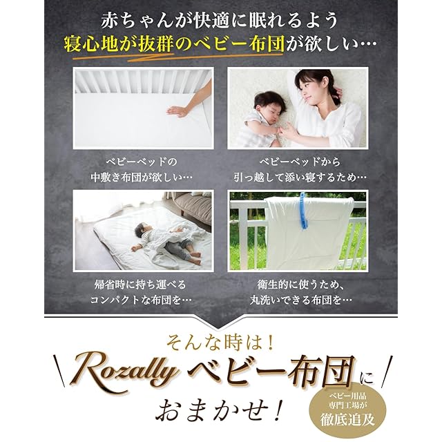 【こだわり】様々なメーカーから ベビー布団や ベビー敷布団 のセットとして” ベビー敷布団 ”が販売されていますが、Rozallyの 敷布団 は”こだわり”が一味違います。赤ちゃん用品をメインに取り扱っている10社以上の工場からサンプルを取り寄せ、「快適な寝心地×コンパクトな持ち運び」を一緒に試行錯誤して頂けた1社に絞って発注を行なっています。