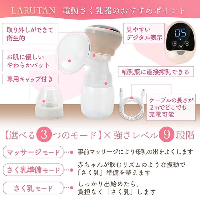 【産婦人科医も推薦】搾乳機 電動搾乳機 さく乳器 搾乳器 電動搾乳機 LARUTAN 自動搾乳機 充電式 ワンタッチ操作 (V5タイプ(さく乳器本体一式【哺乳瓶アタッチメント付き】)(ピンク)) | ascend