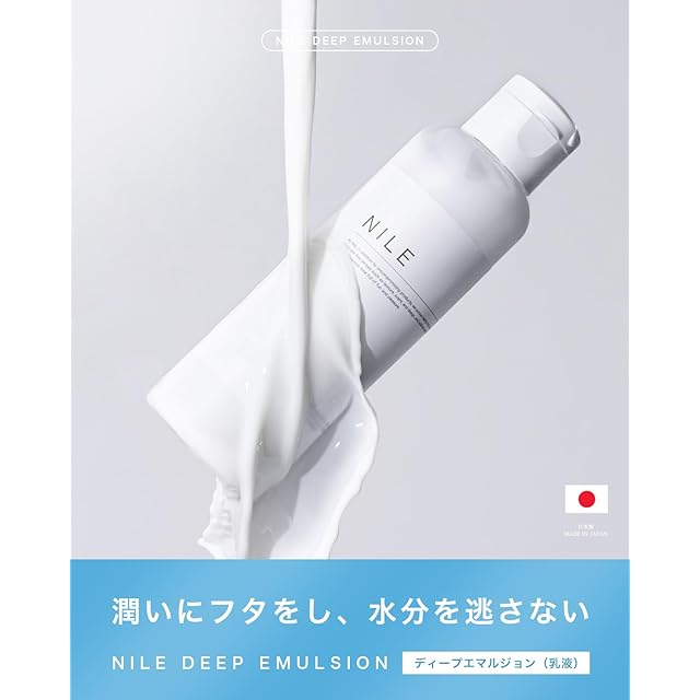 【サラサラ長持ちのヒントはフェイスオイルの採用】NILEデープエマルジョンは一般的な乳液とは異なり、植物由来のフェイスオイル成分を配合しておりこのオイル成分が、一般的な分子量の50%以下の分子サイズをしているため、肌馴染みが良くベタつきを感じにくい仕上がりとなっています。またこのフェイスオイル成分には潤いの蒸発を抑えながら肌を潤し続けるという機能性があります。