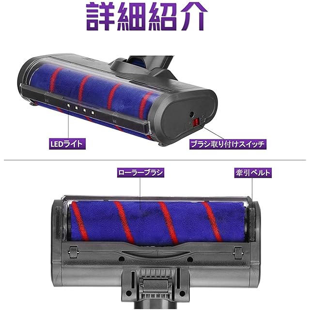 【ご注意】:*1、透明の樹脂部分に左右非対称で線キズのような物が付いてますが、金型の成型跡で不良品では御座いません。この商品はダイソンの互換用品です。*2、警告 :カーペットと畳に使えない、回転しません。滑らかな地面でのみ使用可能です。*3、純正品と比べ厚みがある分、少々重いです。*4、ローラーブラシが回転せずの場合は、パイプが不良かもしれませ。パイプが交換したら、回転できます。