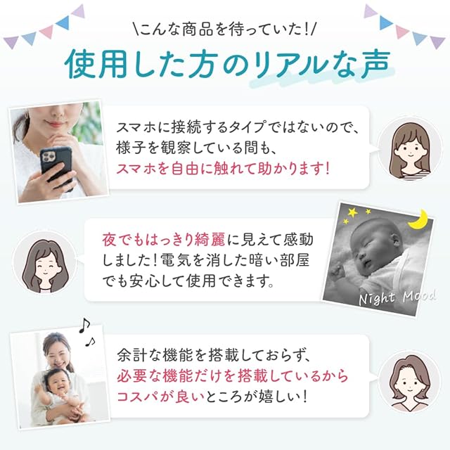 【双方向会話機能でパパもママも安心】 モニターを通じて赤ちゃんにリアルタイムで声をかけられるので、離れていても安心です。すぐに駆けつけられない時でも、赤ちゃんを安心させることができます。