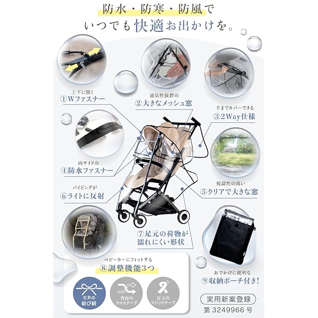 【ママに優しい機能と収納性】上からも下からも開閉可能な、左右のWファスナーを採用。 上部だけを開けて赤ちゃんと気軽にコミュニケーションが取れるのも、この製品ならではの特長です。 下から開けるとフルオープンで、ベビーカーへの乗り降りが簡単です。 また、裾を長めにデザインすることで荷物が濡れにくい工夫もプラス。さらに、手元カバーが手を濡らさず、急な雨でもストレスフリー。ママ・パパ、そして赤ちゃんの快適なお出かけをしっかりサポートします。
