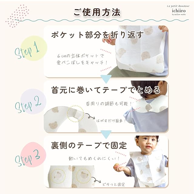 【かんたん装着】ポケット部分を折り返して立体にしたら、首元に巻いて片側の剥離紙をはがしテープで固定。胸元の裏の両面テープでお洋服に貼り付けられるので、赤ちゃんが動いてもズレにくくなっています。