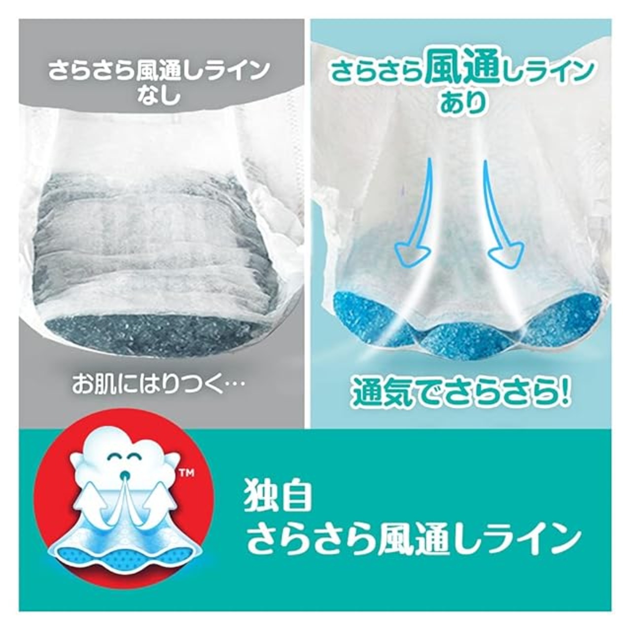 〈独自のシートで2倍さらさら※〉独自の1枚多いさらさらシートで、おしっこもムレも肌によせつけません。※独自のシートなしのパンパースとの比較