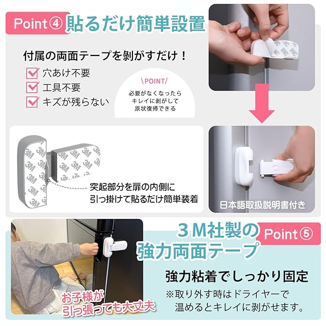 ✅【赤ちゃんとの生活でこんなお悩みはありませんか?】 『子供が勝手に冷蔵庫や引き出しを開けていたずらをする・・・』 『指を挟まないか心配・・・』『誤飲してしまうかも・・・』 こんなお悩みや心配を抱えていませんか?そんなママの声から生まれた冷蔵庫ロック。 この冷蔵庫 ロックがあればすべて解決です。 好奇心旺盛な小さいお子様を危険から守りましょう! 地震の際の散乱防止対策にも有効です。 ご家族やお友達のギフトにも選ばれています。
