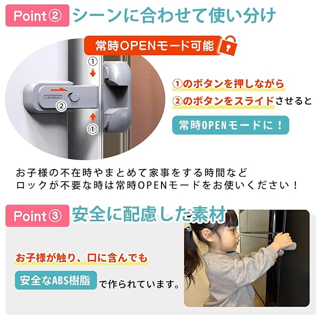 ✅【オートロック式/簡単ロック解除/常時オープンモード】 よく使う冷蔵庫や引き出し。複雑なチャイルドロックは使いづらいですよね? そこで、開け閉め簡単、ストレスのないラクラク操作でロックを解除・施錠。使いやすさにこだわりました! 扉を閉めるだけで自動でロックがかかるオートロック式。 開ける時は片手でボタンを押しながら扉を開けるだけでロック解除できる仕様となっております。 2つのボタンを同時に押しながら開けないといけないので、お子様には、開けにくい構造になっています。 また、お子様の不在時や就寝後、まとめて家事をする時間帯などロックが不要な場合は、常時オープンモードに変更してお使い頂けます。