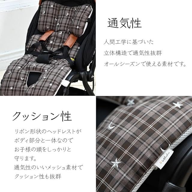 クッション力と復元力に優れており長時間使用してもクッション性が劣化しにくく、通気性のある構造。リボン形状のヘッドレストが赤ちゃんの頭部をしっかり守る。必要な個所のみ厚みを持たせてるため、つけたままベビーカーを畳める。